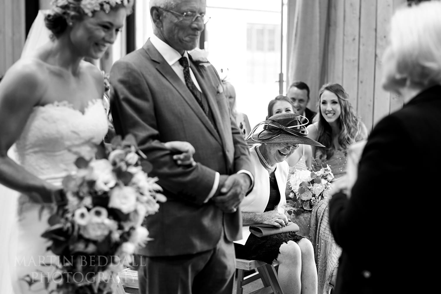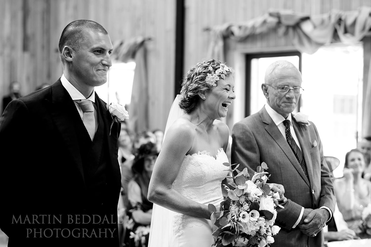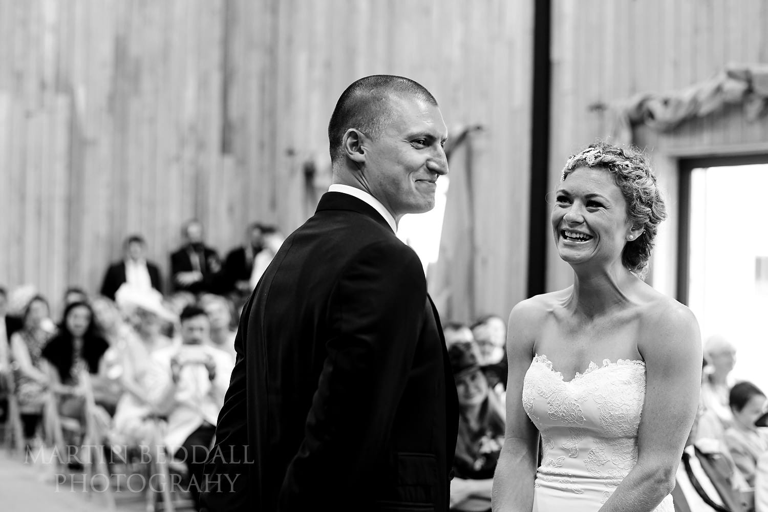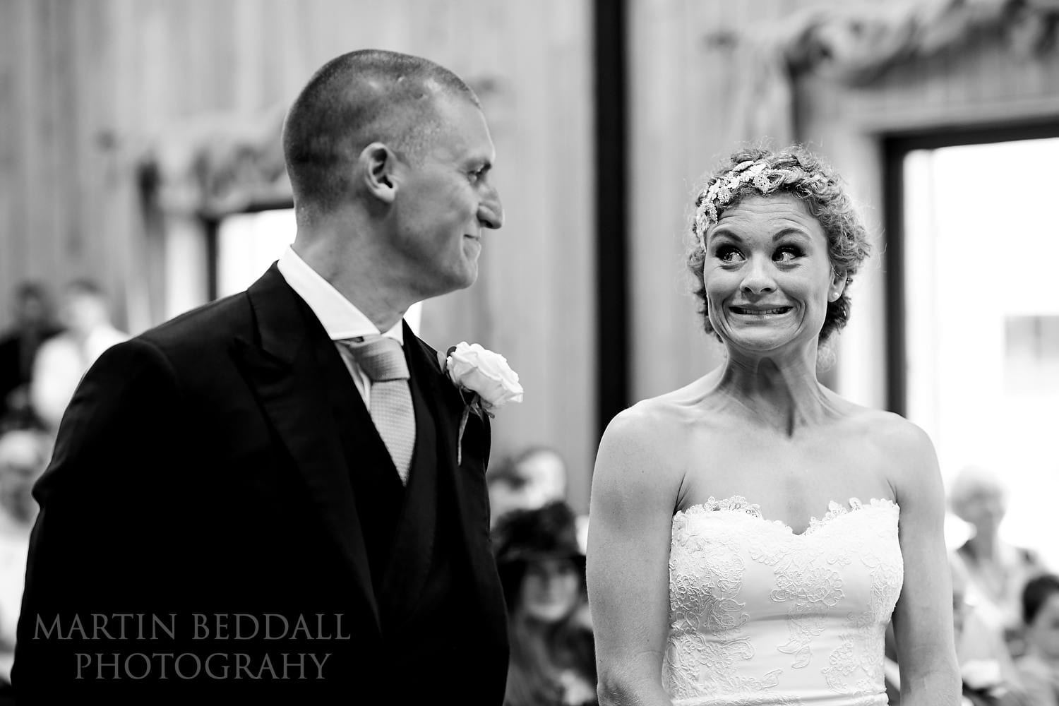 A new Sussex wedding venue for me and looks a bit different to what you see on the Chafford Park website. The large Granary Barn in which the wedding ceremony was to be held, had a makeover during the summer. Gone was the authentic ‘farming’ look of corrugated steel panels – it had been upgraded and clad in wood. Proper doors fitted too. As was mentioned, less ‘farm’, more 1970s Swedish sauna! 😉