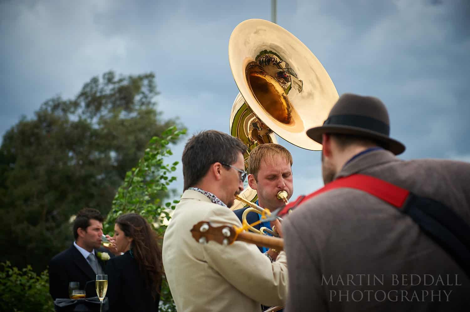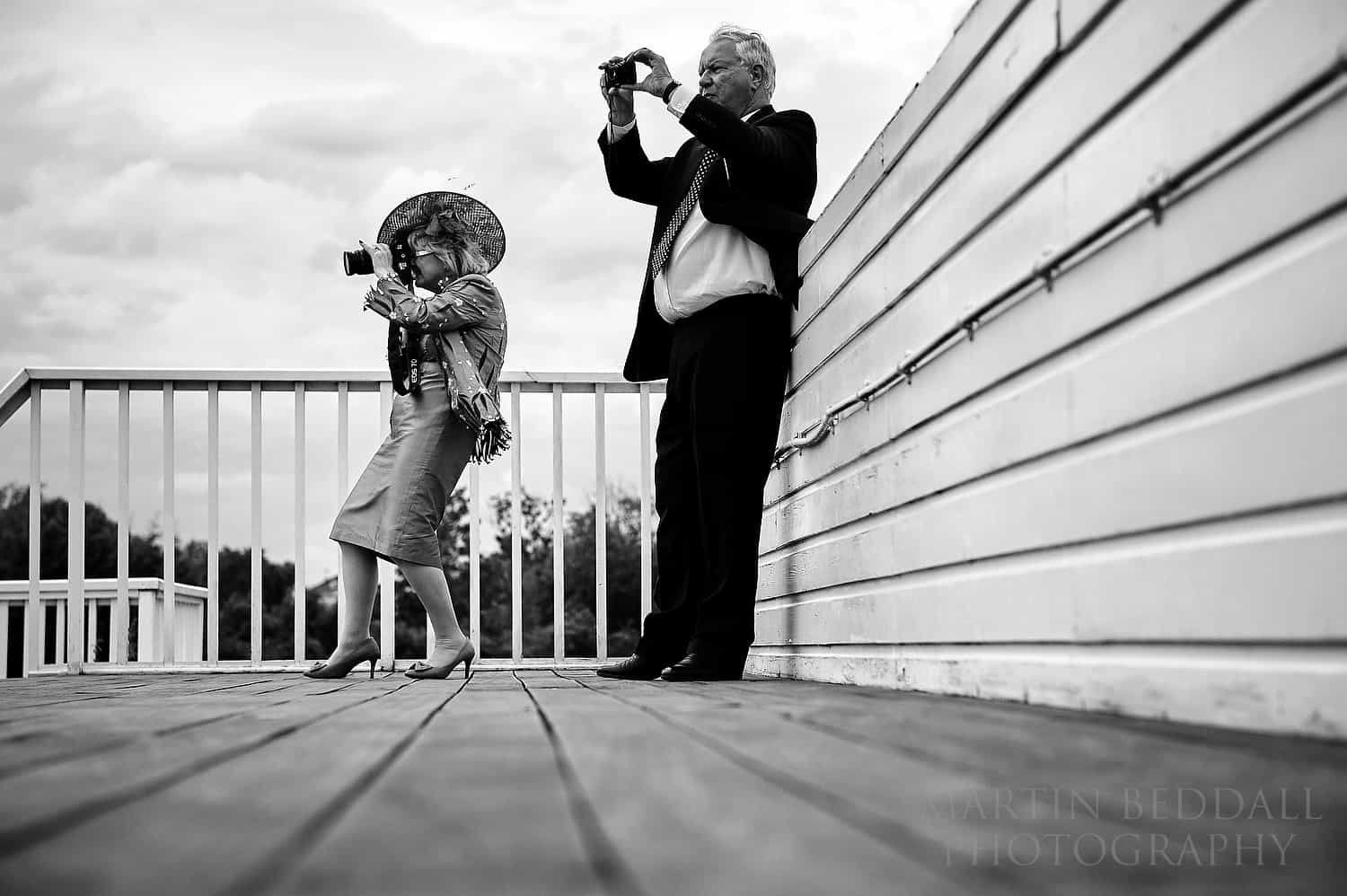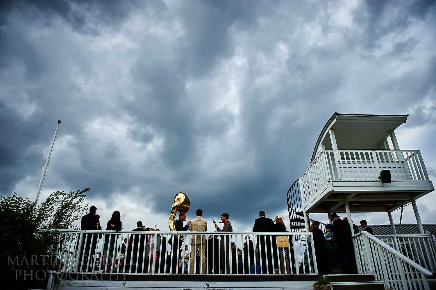 There had been some rain earlier in the morning and it came again at nightfall, but held off in the late afternoon, albeit with some moody skies, allowing the couple and their guests to mingle on the platform. They were accompanied by a small jazz band, that fitted in well to the surroundings.