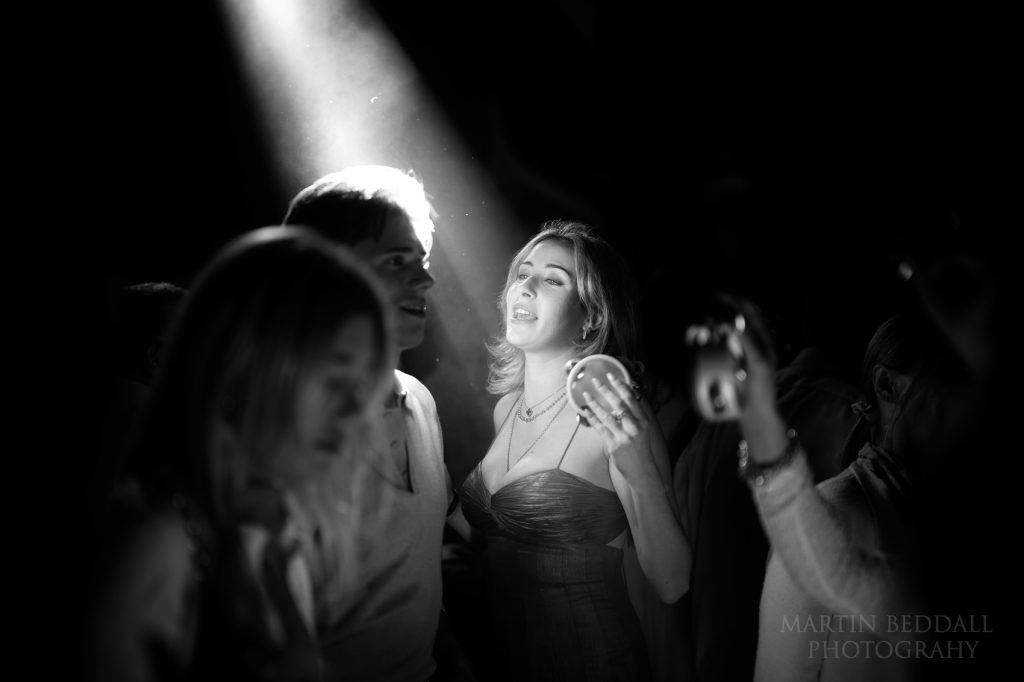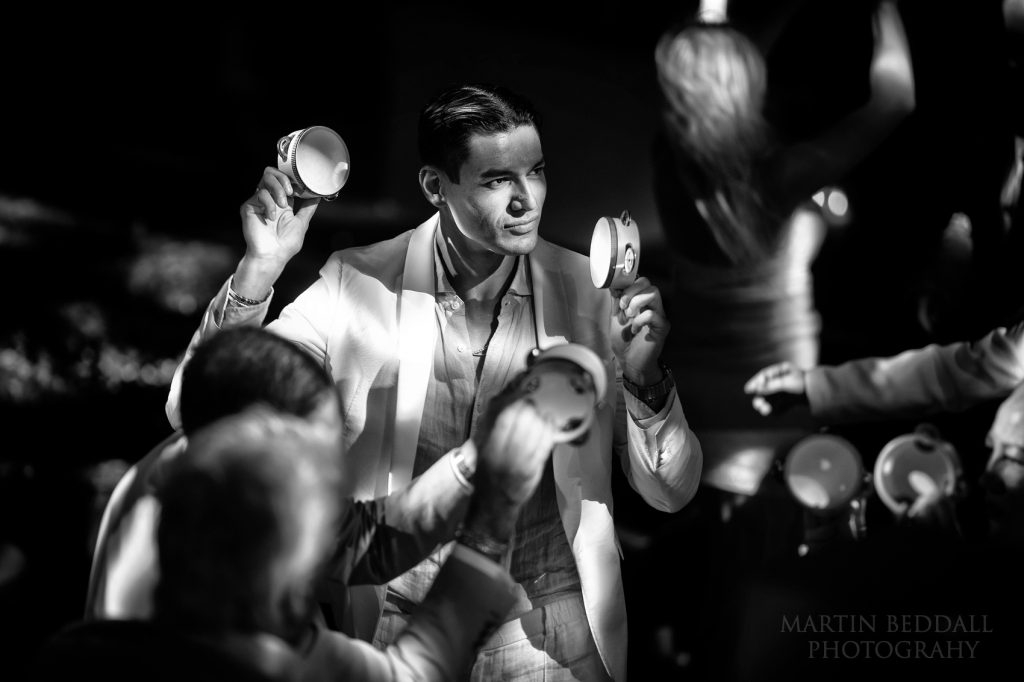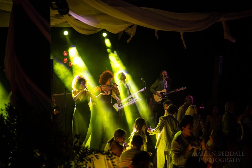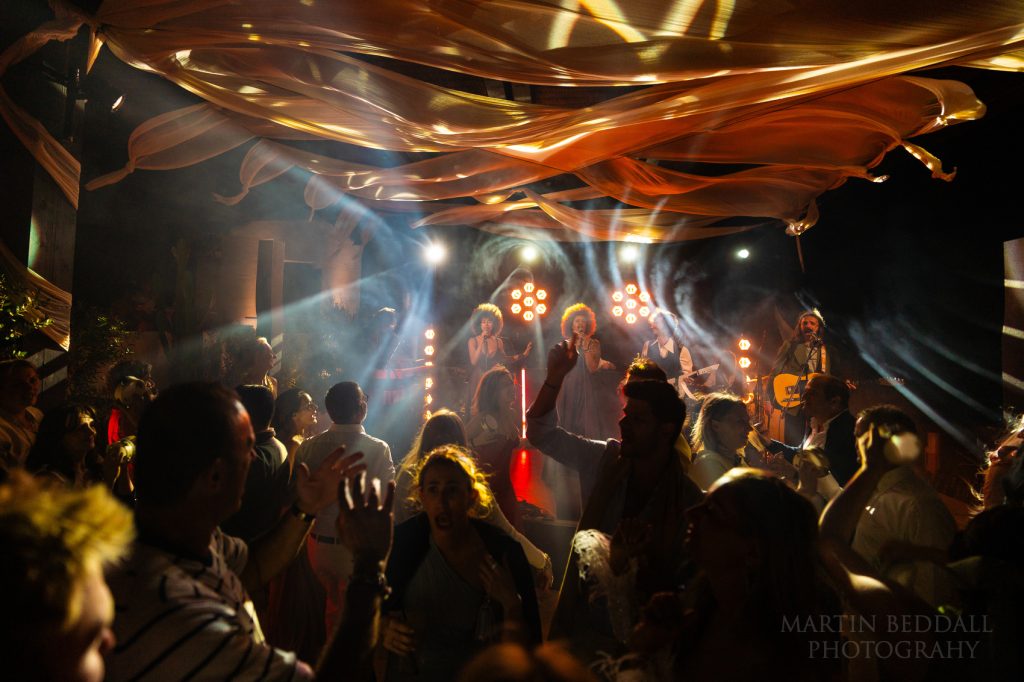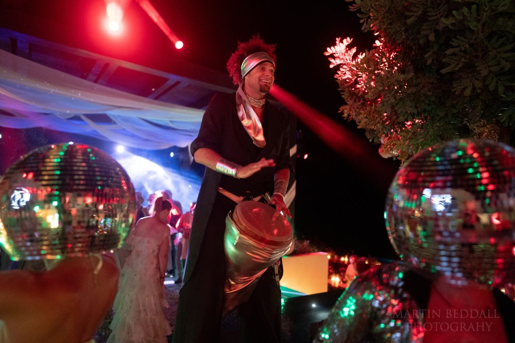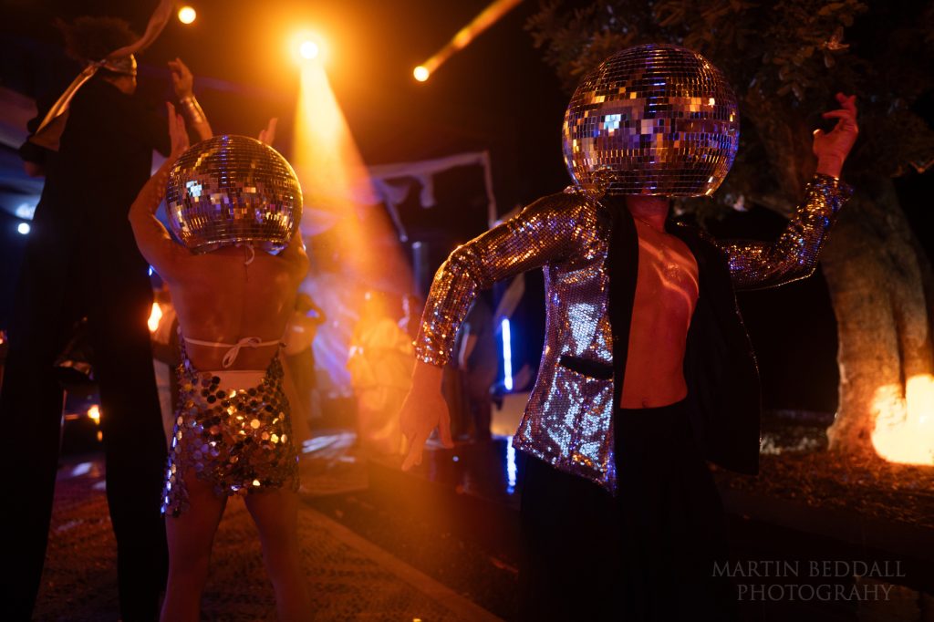 The music starts. Now, usually at this point it is when I need to set up some Profoto lights, to illuminate the dance floor. I had flown over with a couple of lights, a lightstand and a trigger – they stayed in my bag throughout my time in Greece. When I said this wedding in Greece had a big budget, one look at the lighting setup confirmed it. A gift. As is a good band. This band, SuperPop, had flown over from Italy. They were followed by a DJ duo, from the USA (?), along with dancers wearing Glitterball heads…not your average wedding.