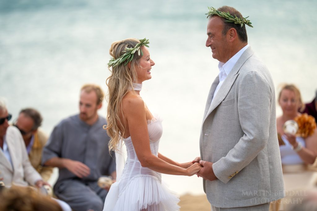 With the wedding guests gathered on the beach, along with Jeremy and his best man, Jeremy’s big boat crept around into the small bay. Bravely, Oli transferred from this boat, into the small fishing boat, to be dropped off on shore, Jeremy waiting to escort her along the seashore and into the circular wedding spot – designed by Olia. The guests then took their seats, surrounding the wedding couple and the ceremony could begin. Heartfelt vows and instead of rings, laurel wreaths to wear. After the ceremony, Olia and Jeremy walked to the side of the beach to throw these wreaths into the sea, as the guests made their way back up the cliff to the hotel.