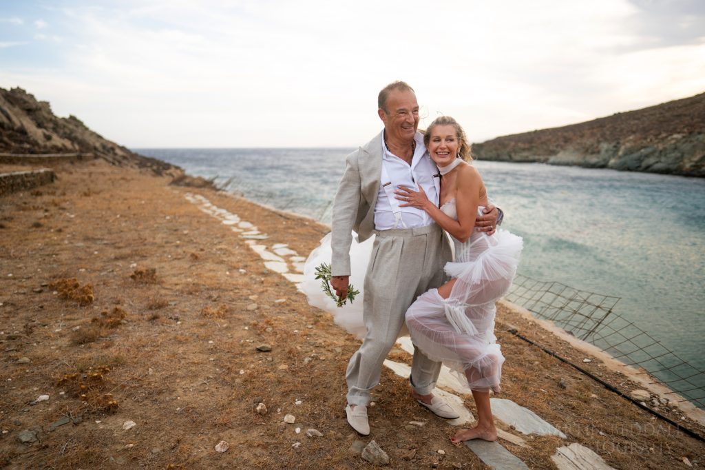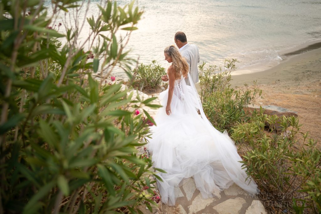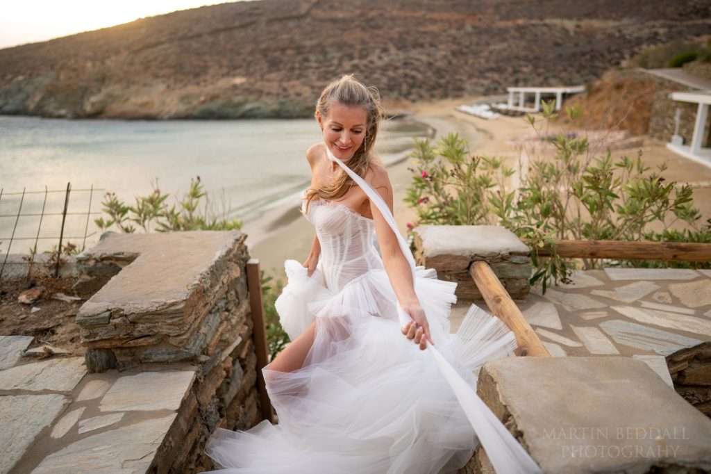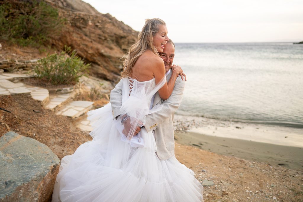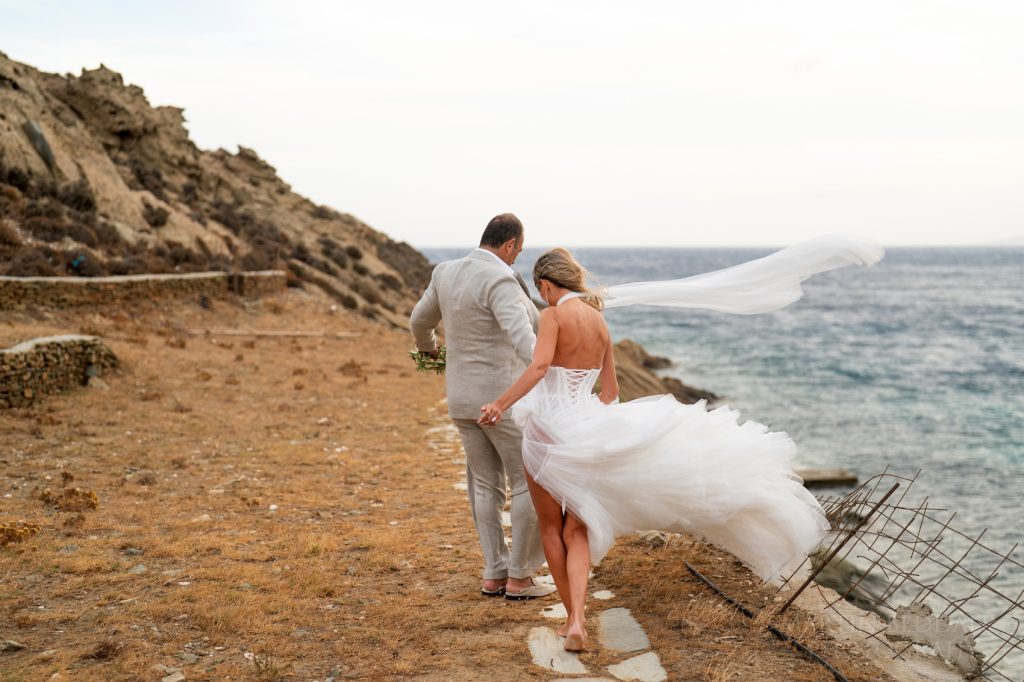Day Two for this wedding in Greece, on the island of Tinos. The ‘wedding day’ – a ceremony on the beach, and then a big party overlooking the sea. All at the five-star Odera Tinos hotel. The wind? It was still strong and unabating. It meant a bit of tweaking to the timing of the day. That and ensuring there was another light at the end of the ceremony. With Olia’s plan to arrive at the beach in a small, traditional fishing boat, it meant a few changes to the plan. The sea was choppy.