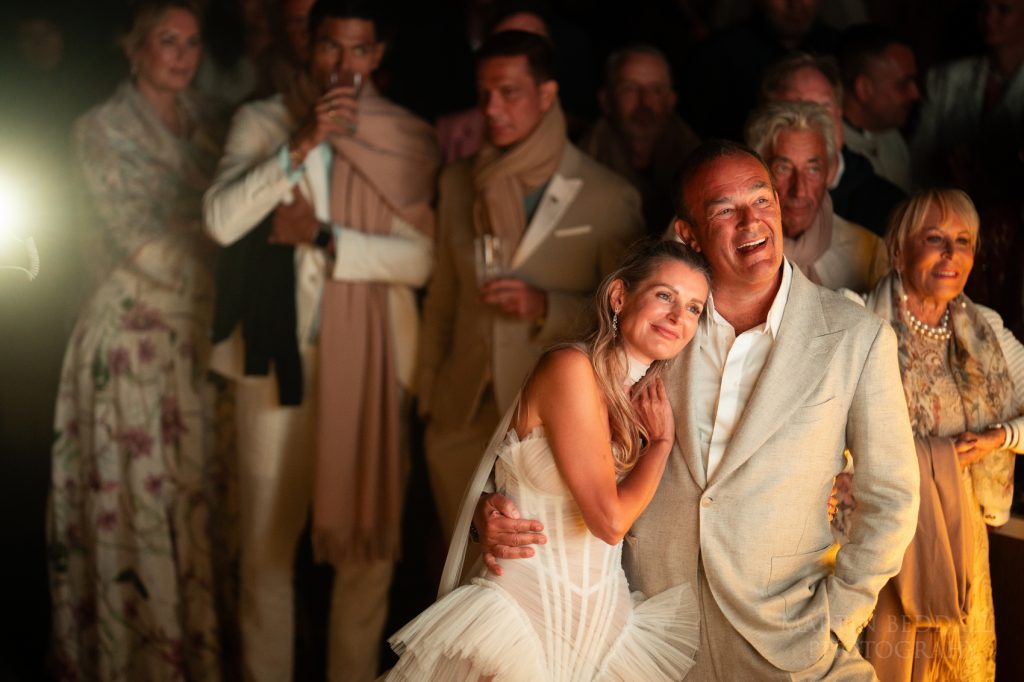 For those who didn’t use the ‘golf carts’ to get back up the cliff to the reception space, the drinks were very welcome. The sun had by now dipped behind the edge of the bay. It was time for the evening events to start, kicked off by Jeremy completing the Jewish tradition of smashing a glass. Long tables had been set out for the evening meal. Careful where you stand, it was right next to the infinity pool. (Shooting in the area was tricky, some very dark drops in places…) Speeches and food. Slightly cut short in the end, as the party needed to get started. So after a giant cake – you scopped your fill of it with a bowl and a screening about Olia and Jeremy’s charity work, and a quick change of outfit for Olia and a brief first dance, the music started…